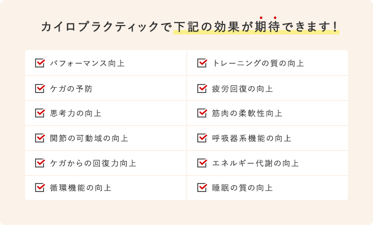 サブラクセーション(神経の正常な流れを妨害してしまっている骨格の歪み)を取り除く事で、運動神経、感覚神経、自律神経などの神経機能が働き、また関節の可動性なども向上する事から、身体機能の向上におけるパフォーマンスやトレーニングの向上、ケガの予防、ケガや疲労などからの早期回復、精神の安定など、あらゆる場面において、身心への好影響へと繋がります。